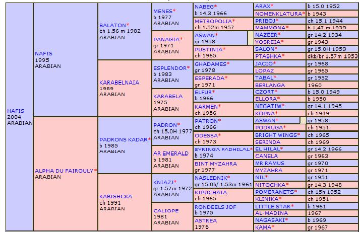 Nafis est un fils du grand Balaton "Champion d'Europe" 1992 qui est considéré comme « le cheval du siècle ». Cet étalon mondialement reconnu est né en 1982 au haras de Tersk et il attache son nom à une descendance de grande qualité.